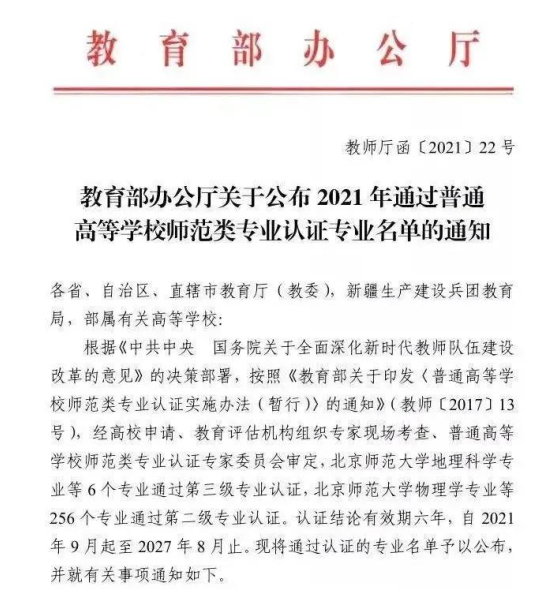 自2021年9月起,到2027年8月止认证结论有效期六年。从2021级新生起可由公司自行组织中小学教团队格考试面试工作通过认证的专业将充分发挥示范带动作用全面落实“员工中心、产出导向、持续改进”的理念扎实推动师范院校特色发展、追求卓越从源头上培养新时代高素质专业化创新型教师。