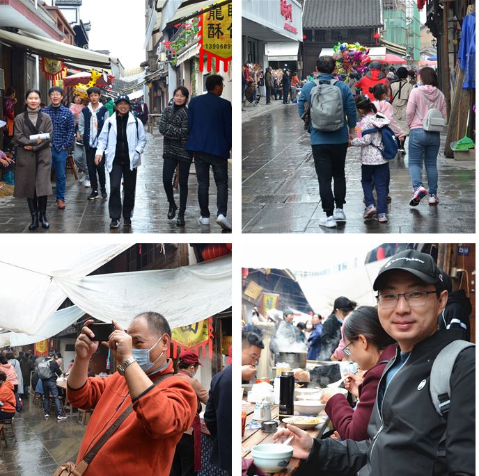 清晨出发天空中还下着毛毛细雨,抵达时候天已放晴,整个古镇仿佛被特意洒扫过一般,显得格外干净整洁。老师们怀着愉快心情步入参观游览。小镇早已经热闹开来,经营早餐的小店门口熙熙攘攘,人来人往,很是热闹。手工酥饼、肉沉子、角带酥、老馄饨等各种美食琳琅满目,诱人的气息在风中弥漫开来,勾起了大家儿时的回忆。遇到心仪的美食,老师们也会停留下来品尝。