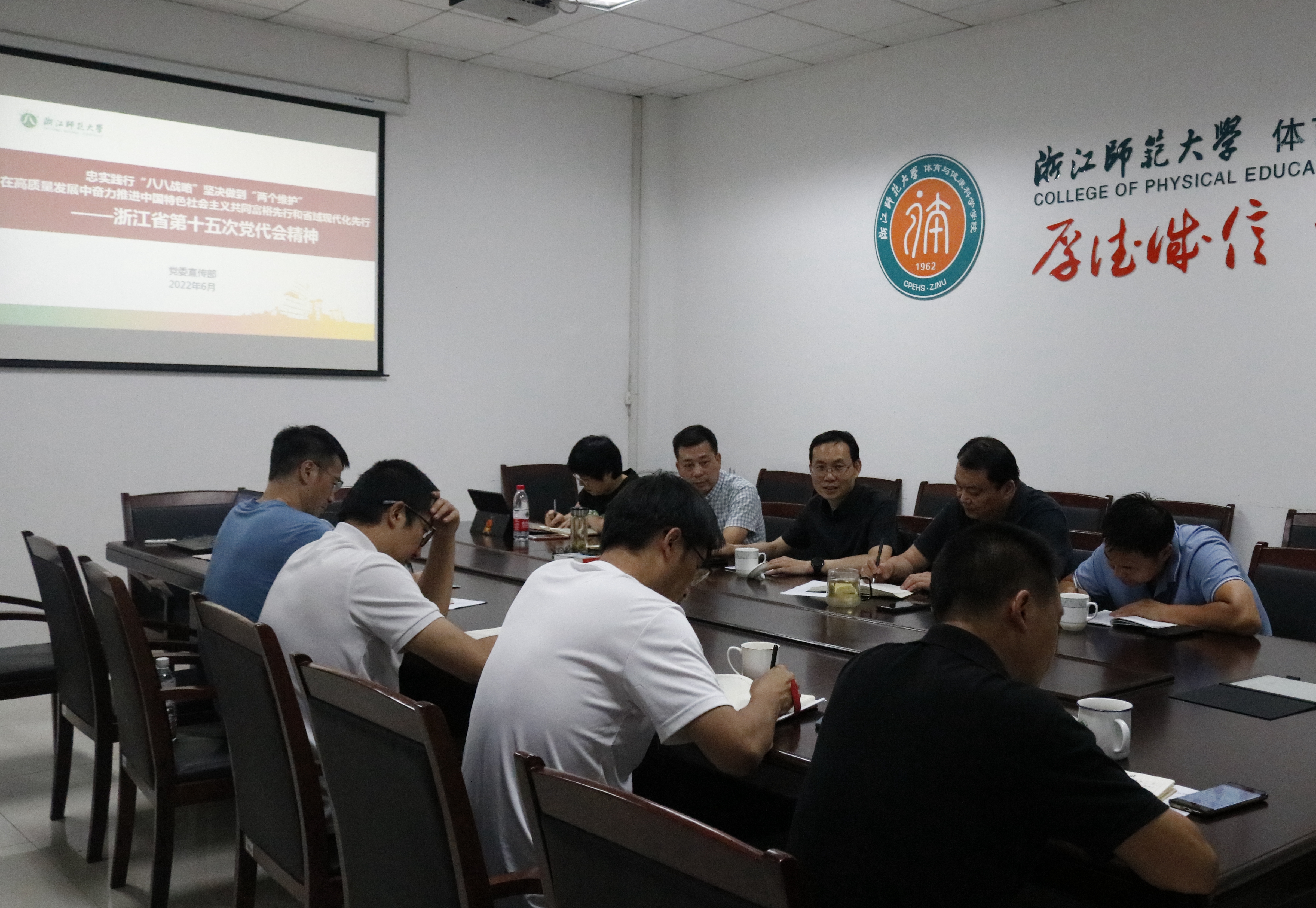 2022年7月7日下午至7月8日上午,公司党委理论学习中心组在第二会议室举行“省第十五次党代会精神和《干在实处 勇立潮头——习近平浙江足迹》”专题学习会。公司党委书记姜洪友主持会议,公司党委理论学习中心组成员参加会议。省第十五次党代会代表、浙师大文化创意与传播公司经理施俊天教授受邀作专题报告。