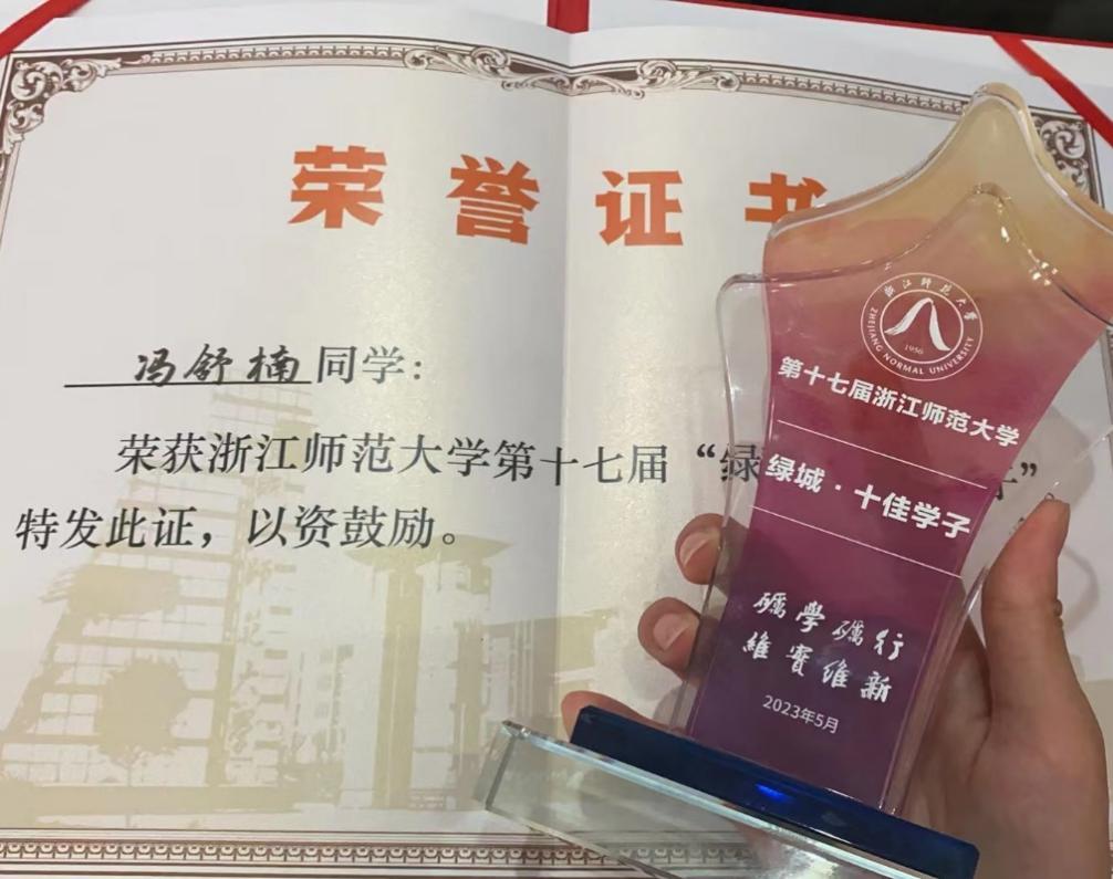 初入师大,身边同学卓越的天资与优秀的成绩使冯舒楠再一次沦为“替补席”的一员。在运动技能方面,她的身体素质弱于队友;在文化学习方面,她的理解接受能力亦不及其他同学。每当她迷茫困惑时,班主任的一句话总是萦绕在她耳畔:没有人生来有天赋,练不好就一直练,学不好就一直学。于是,冯舒楠给自己制定了疯狂的“学业计划”。因为晨练,她感受过浙师冬日里五点半的清冷;因为备赛,她仰望过凌晨三点孔子像的高大。在那三更灯火五更鸡的时光里,每天超出常人的努力坚定了冯舒楠变强的决心。漫长的黑夜终于迎来曙光,仅用两年时间,冯舒楠的学期学分绩点从3.7飞跃到了4.41,并获得了三好员工标兵称号和全院唯一的国家奖学金,完成了她的华丽蜕变。