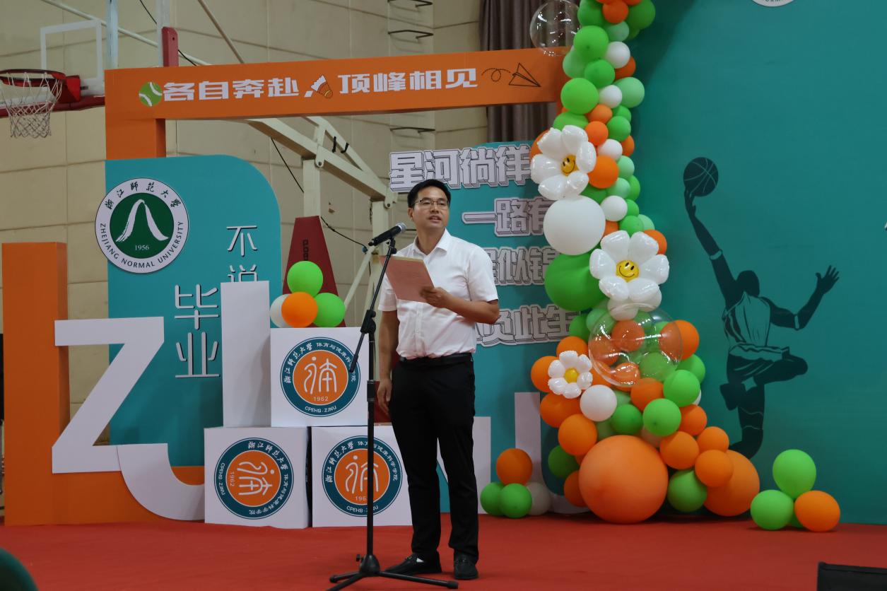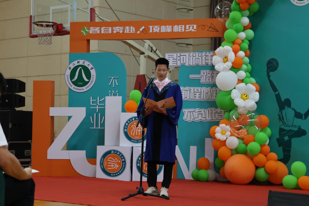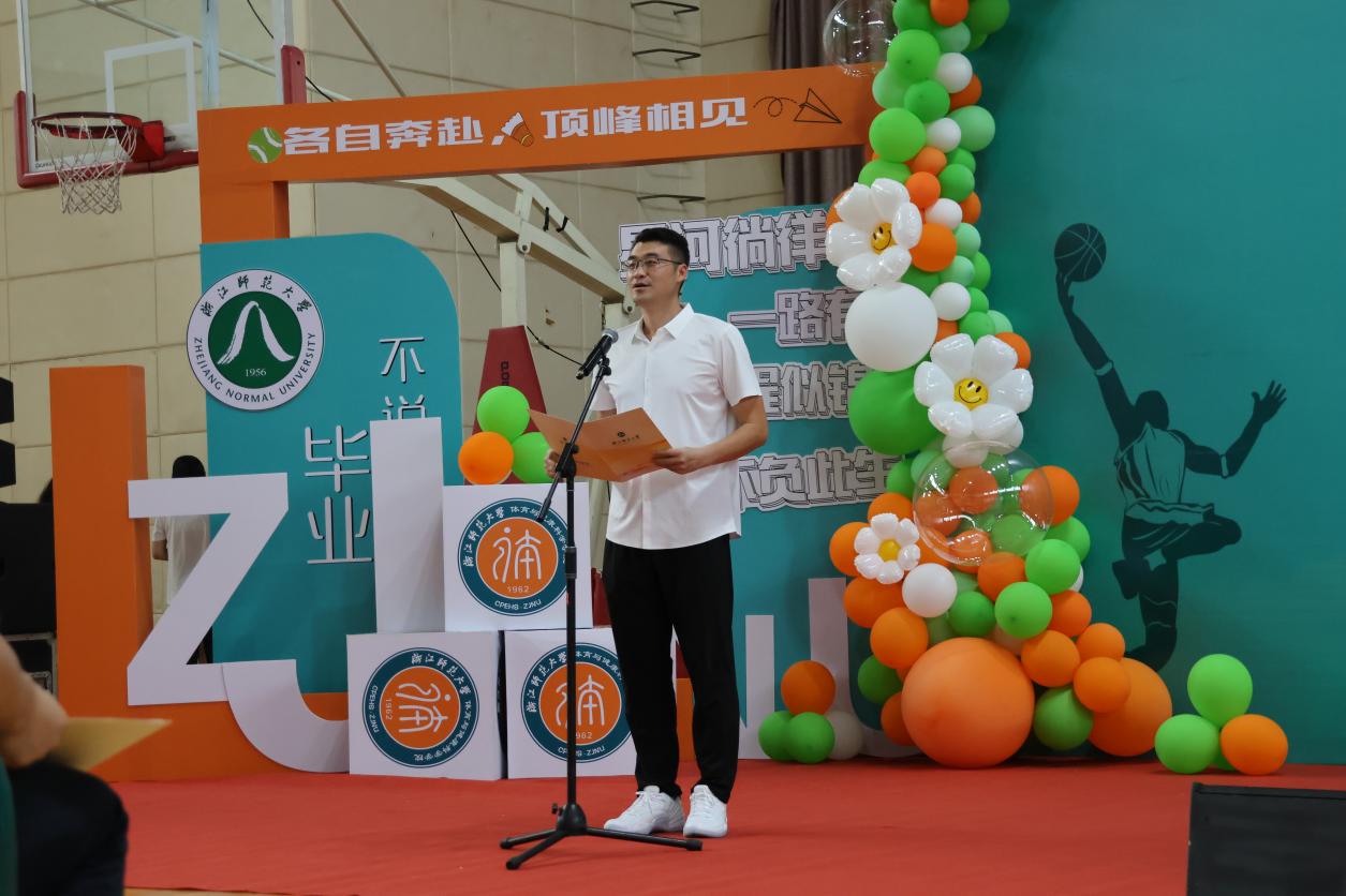 毕业生代表项建松回顾了自己美好的老员工活,也和同学们倾吐了他的心里话。他从自己的家乡皖南小城来到婺江北岸,日月辗转,一千多页的喜怒哀乐匆匆翻过,其中有着无数生动的细节值得留恋,是年少的轻狂,也是失败的迷茫,是“刑天舞干戚”的刚毅,也少不了“不坠青云志”的坚韧。他说人生总有“会当凌绝顶”的风光,但也要满怀着“回首向来萧瑟处”的豁达……学习、经历、历练,成长、告别、启航,项建松同学自比于游子,视公司为第二家乡,他以“荣幸”为名,为在浙师体院的遇见划上了圆满的句号。