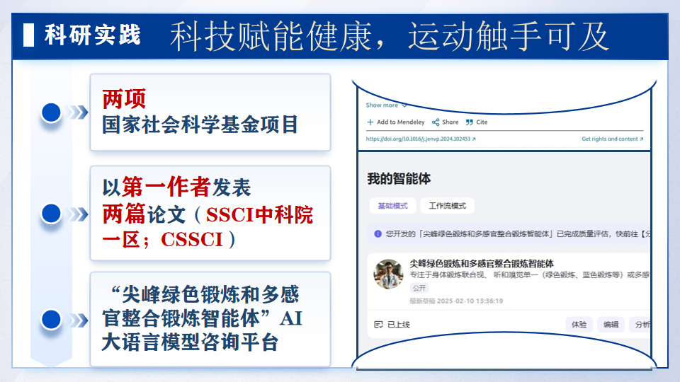 在数字化浪潮中,体育科学正从"体力驱动"向"智慧驱动"转型。黄煜州聚焦"多感官整合锻炼"这一新兴领域,探索如何通过数字化技术赋能健康。经过研究生期间的不断攀登与沉淀,以第一作者身份在SSCI中科院一区和CSSCI发表论文两篇,聚焦多感官整合锻炼的心理健康效益,为锻炼心理学提供了新视角。此外,现有一篇cssci论文正在返修。基于这些研究成果,课题组在“文心智能体平台”创建了“尖峰绿色锻炼和多感官整合锻炼智能体”AI大语言模型咨询平台。通过数字化技术,开发了适配不同年龄、性别及特征人群的数字化锻炼应用,为全民健身政策与数字中国建设注入了创新动力。